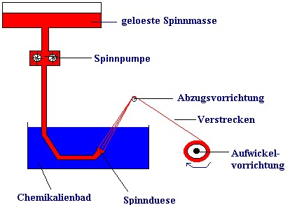 nach mehreren weiteren Verarbeitungsschritten als Faser aufgewickelt werden. Das Nassspinnverfahren